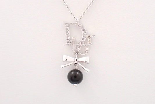 Dior Vintage Black and Silver Bow Crystal Embellished Pearl Drop Necklace