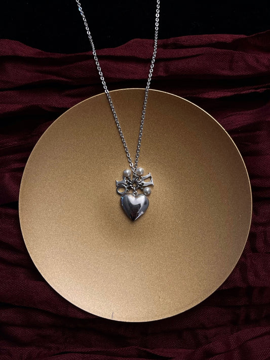 Vintage Dior Heart Pearl Crown Silver Necklace (Large Size)
