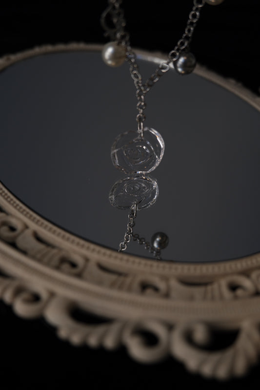 Dior Vintage Glass Rose & Pearl Charm Necklace (Silver Tone)