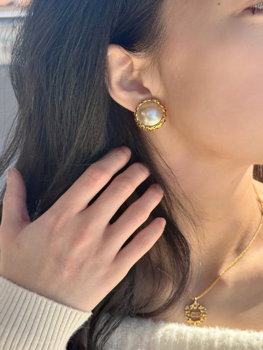 Chanel Vintage Round Clip-On Earrings with Faux Pearl Center and Gold Filigree Frame