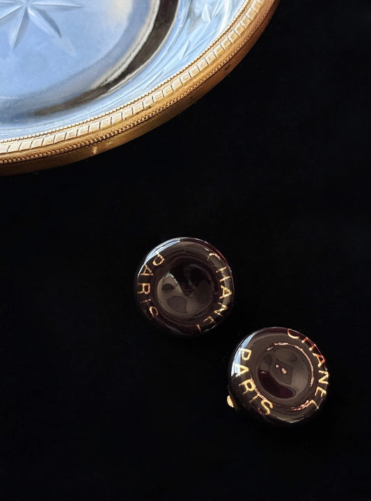 Chanel Vintage Black Resin Clip-On Earrings with Gold “CHANEL PARIS” Lettering