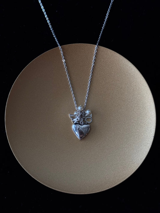 Dior Vintage Silver Heart Pendant Necklace with Pearl Charms