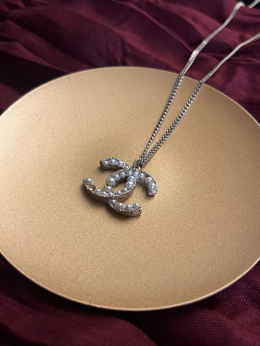 Dior Vintage Silver Logo Necklace with Purple Pearl Beads and Teardrop Charm
