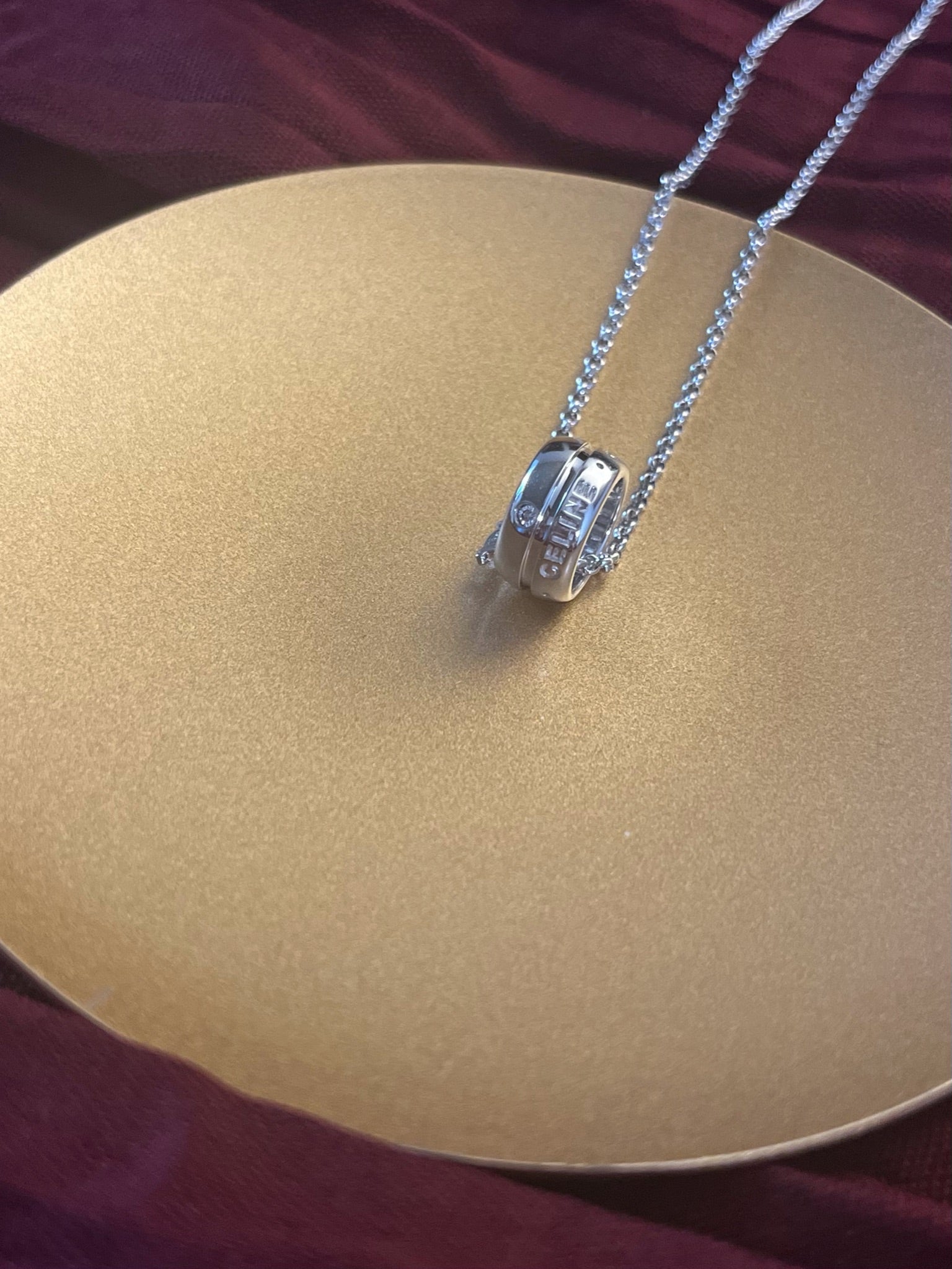 - Features: Engraved CELINE logo ring pendant with hanging Triomphe detail, polished finish, delicate silver chain