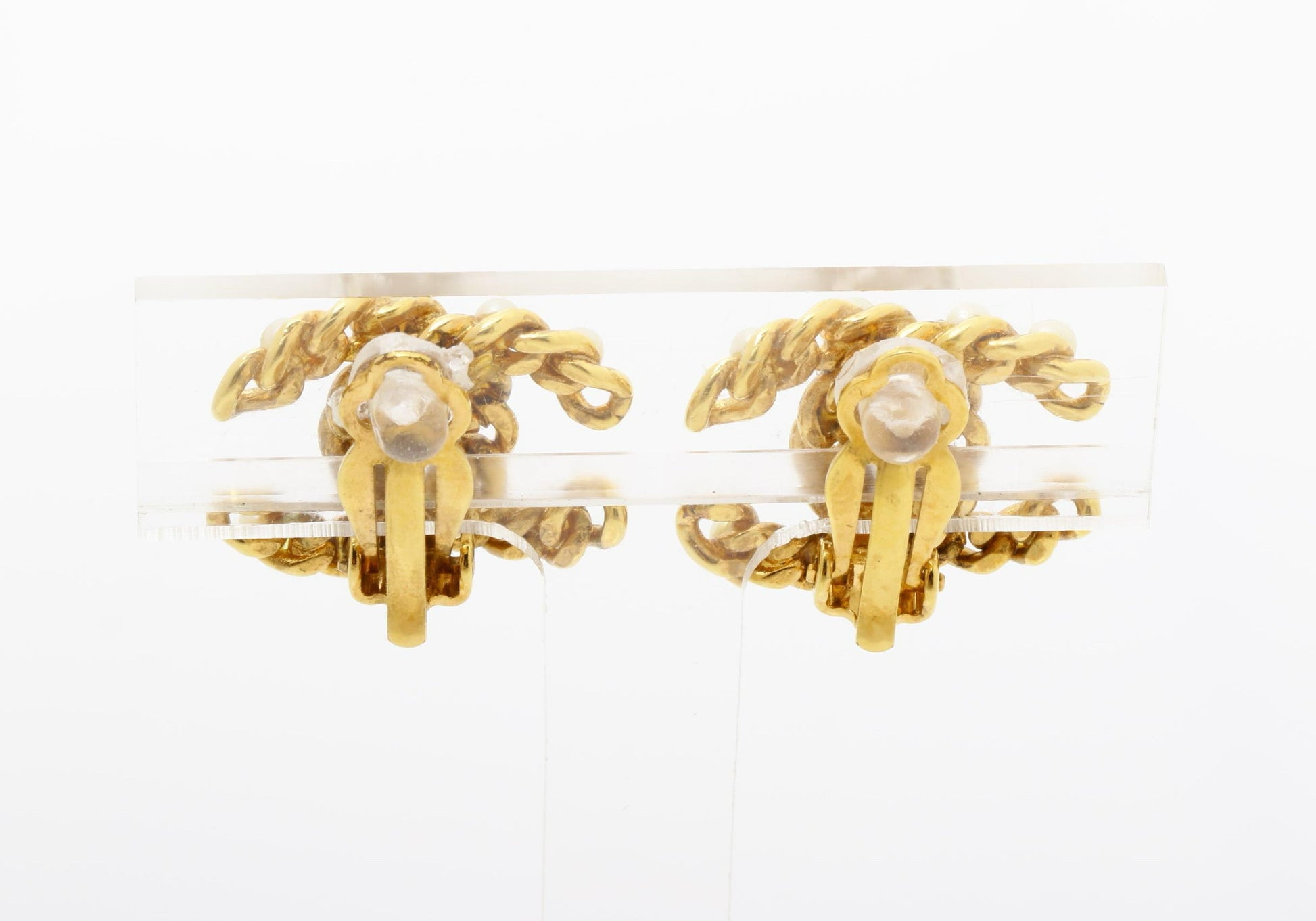 Elegant vintage Chanel ear clips featuring lustrous pearls set in gold-tone metal with the iconic CC logo. Timeless and versatile, perfect for adding a touch of classic sophistication to any outfit.
