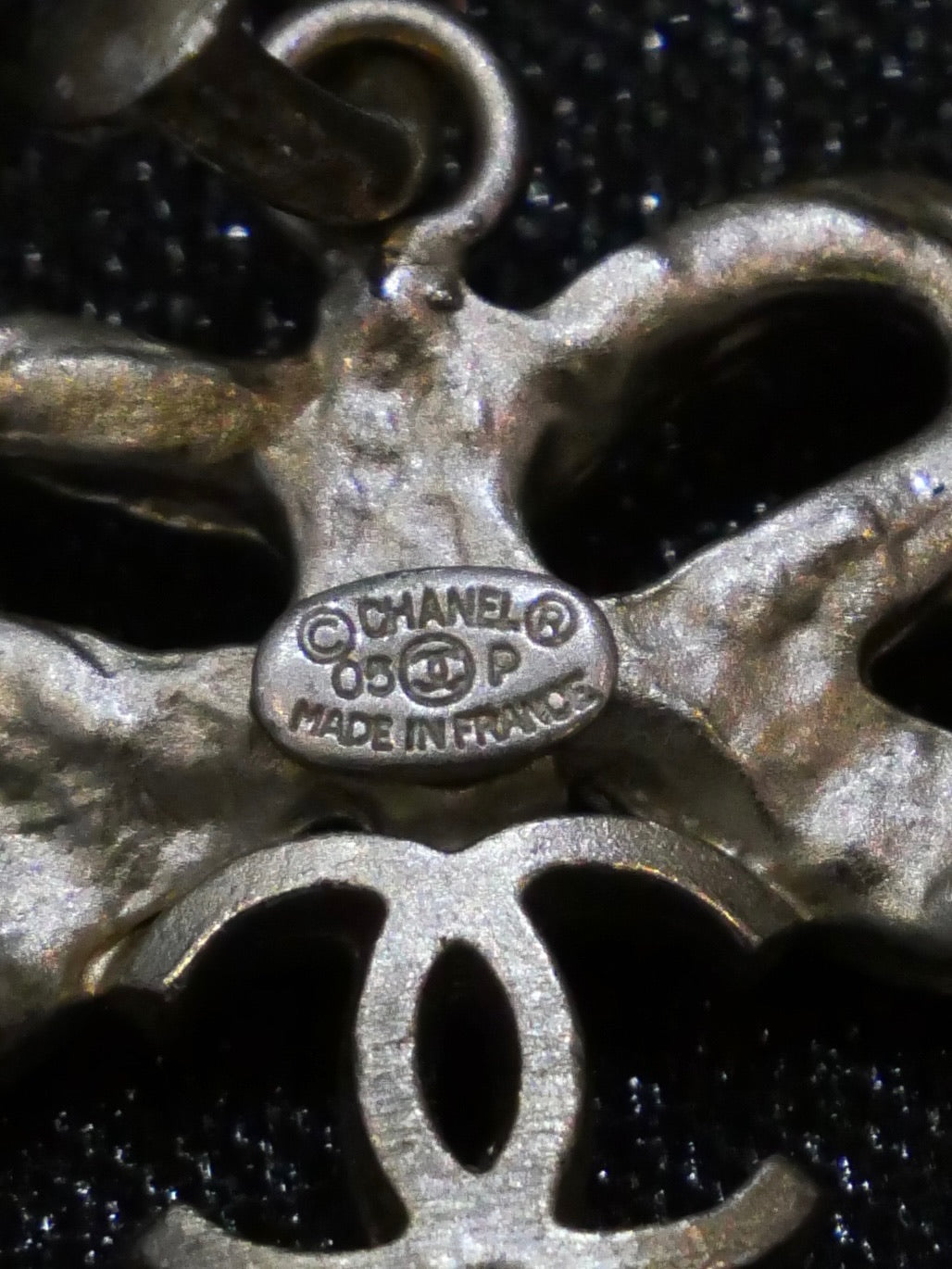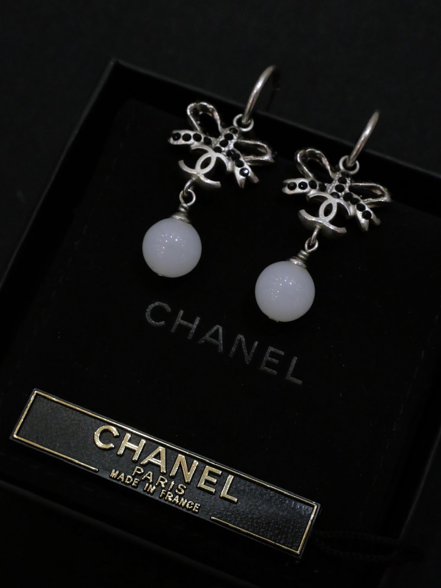 These Chanel 2005 drop earrings feature a delicate bow motif adorned with black crystal accents and the iconic CC logo, finished with elegant faux pearl drops. The long silhouette adds movement and softly elongates the face, blending playful charm with Chanel’s signature dark, romantic aesthetic.