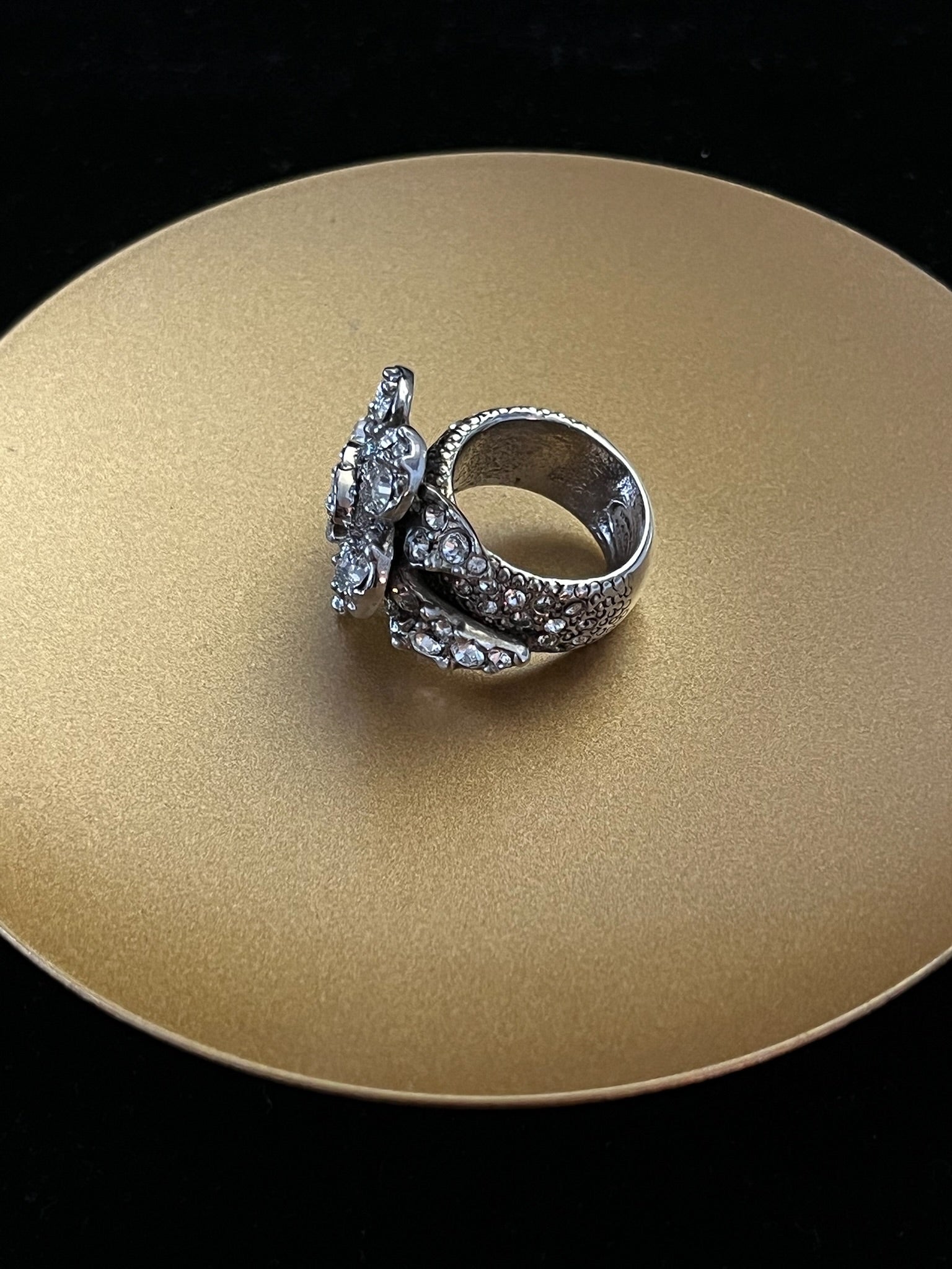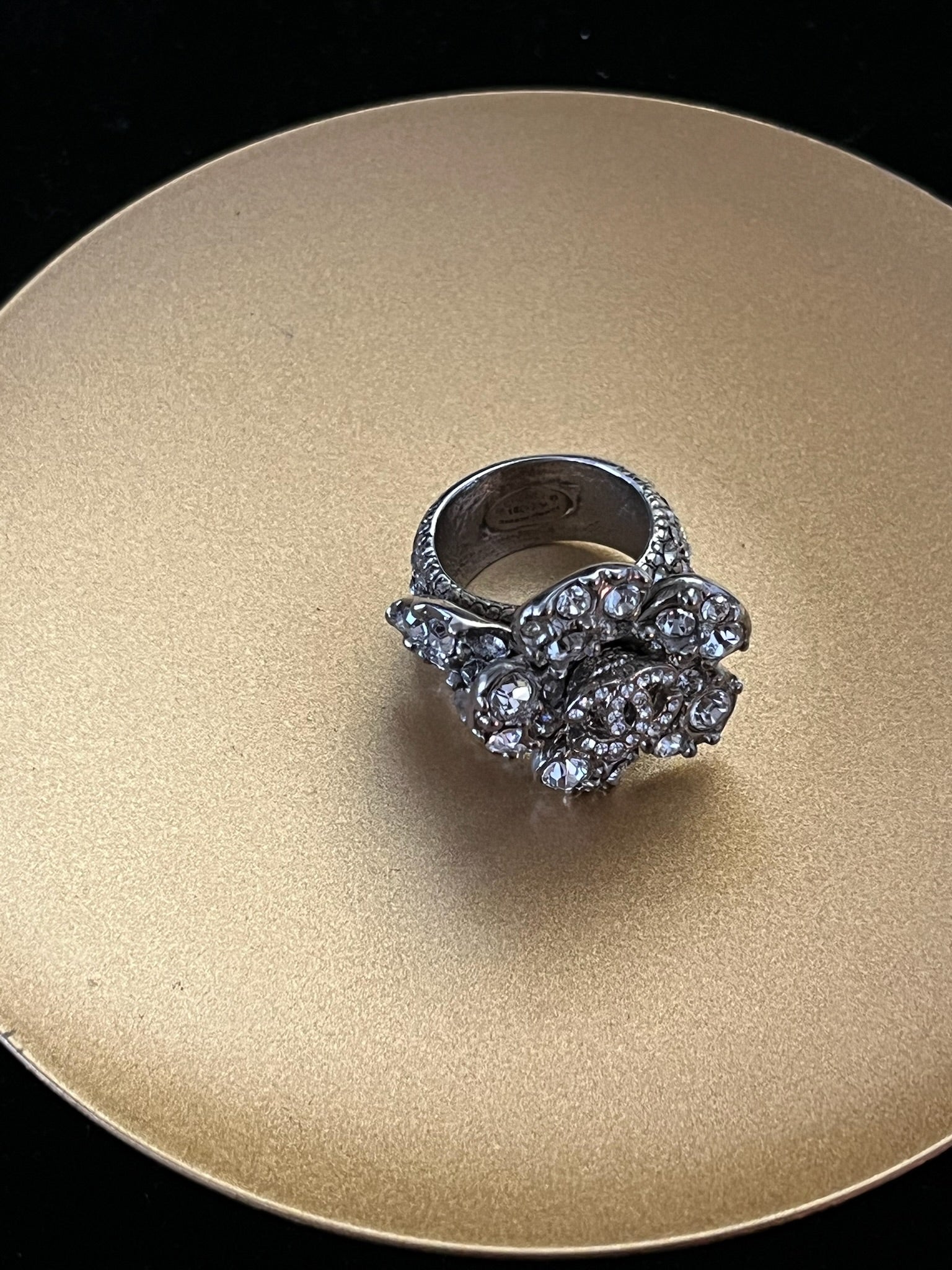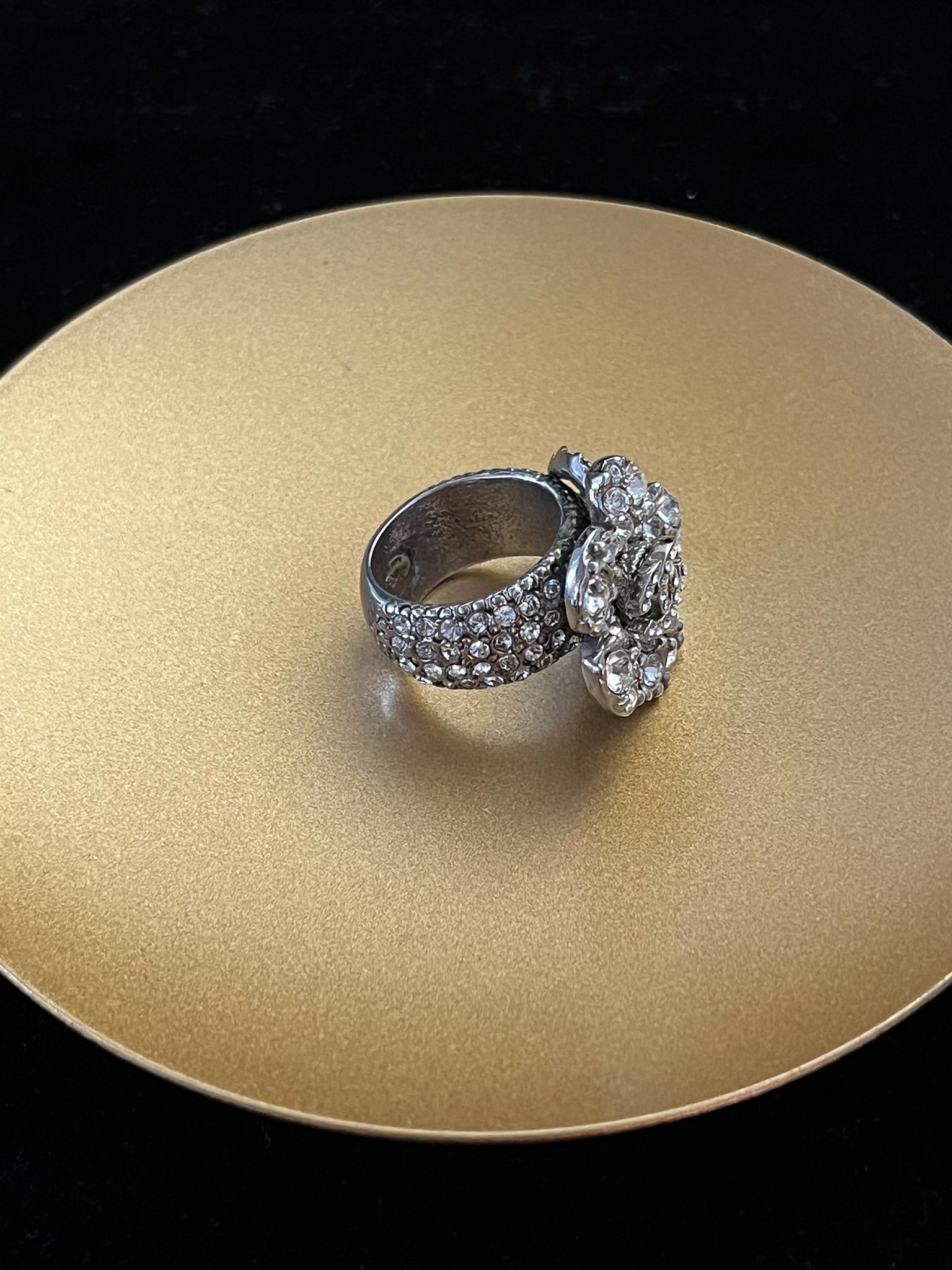 A dazzling vintage Chanel ring from 2010 featuring a starburst crown design fully encrusted with crystals. Bold and elegant, perfect for making a statement or adding a touch of luxury to any outfit.