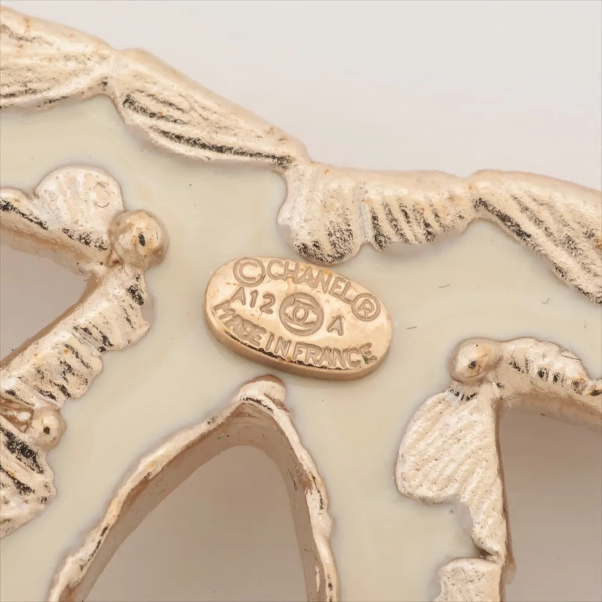 A timeless Chanel brooch from 2012 featuring a creamy white camellia accented with gold edges. Effortlessly embodies the elegance of Chanel, adding a soft and refined touch to any outfit.