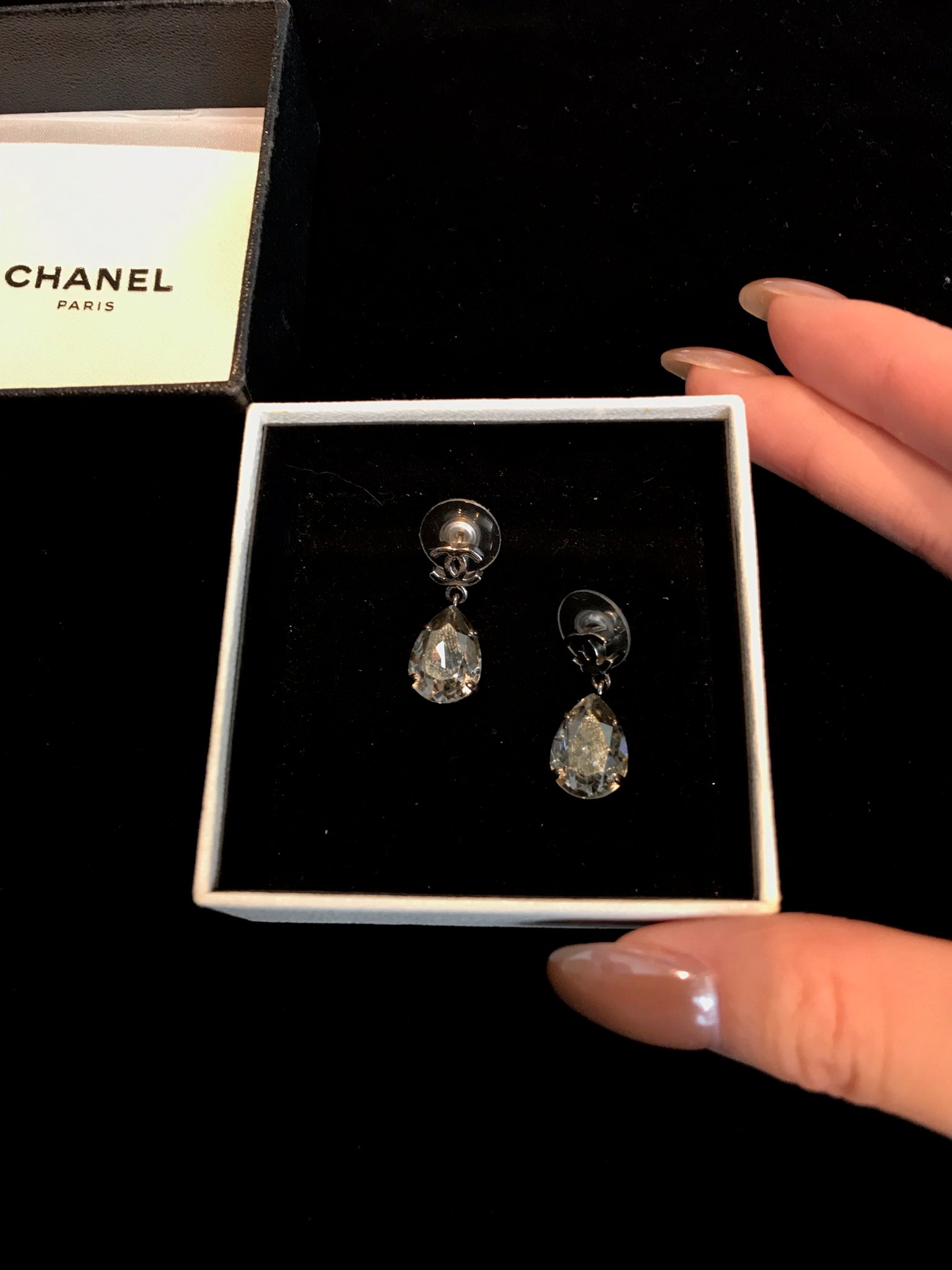 Elegant 2012 Chanel earrings featuring sparkling diamonds suspended beneath the iconic double C logo in a silver-tone setting. A timeless design that combines brand signature with delicate luxury.