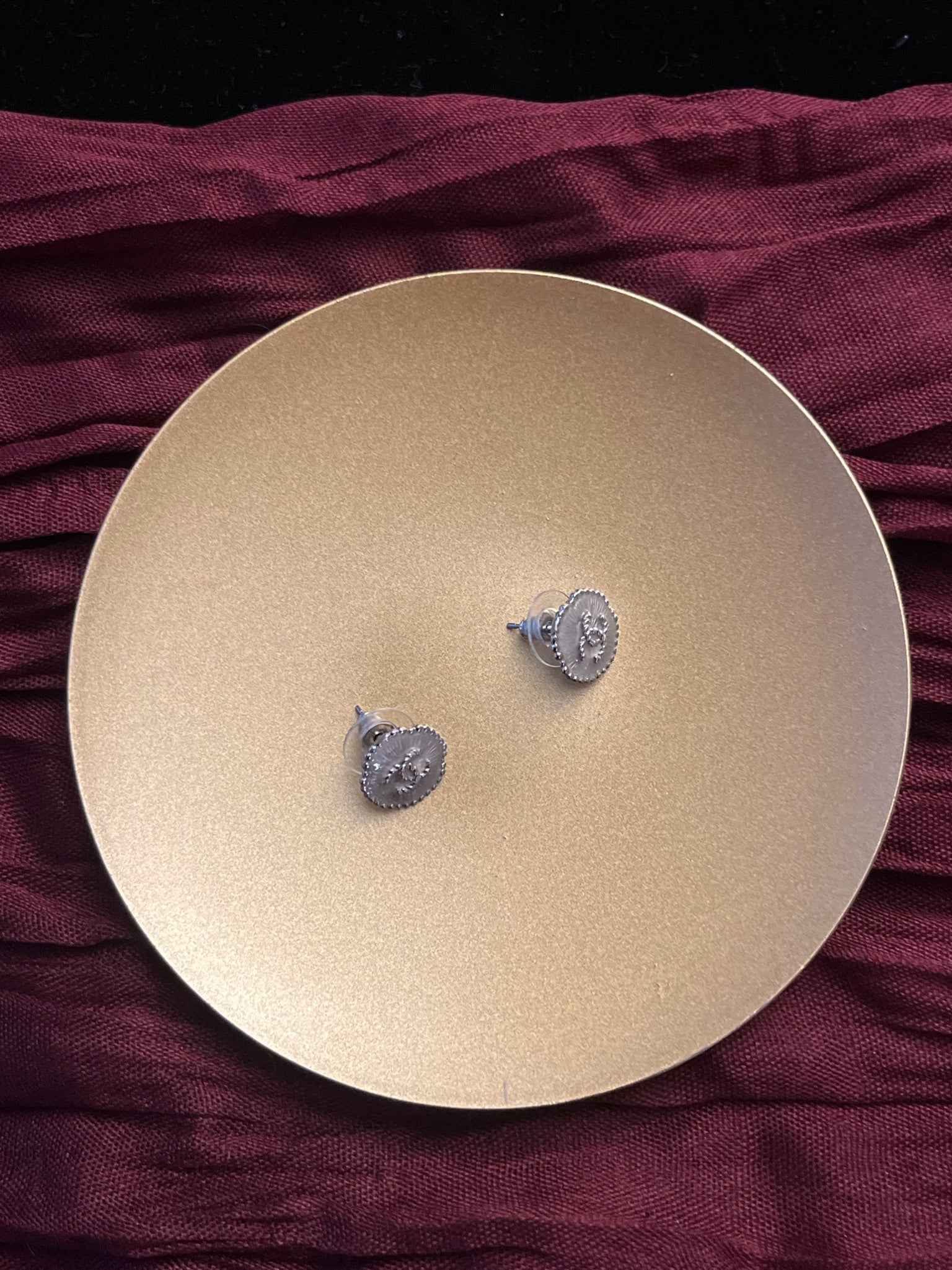 A refined pair of Chanel 2015 vintage stud earrings featuring the iconic CC logo set within a delicately textured circular design. Finished in elegant silver-tone metal, these earrings offer a minimalist yet timeless look that’s perfect for everyday wear or subtle sophistication.