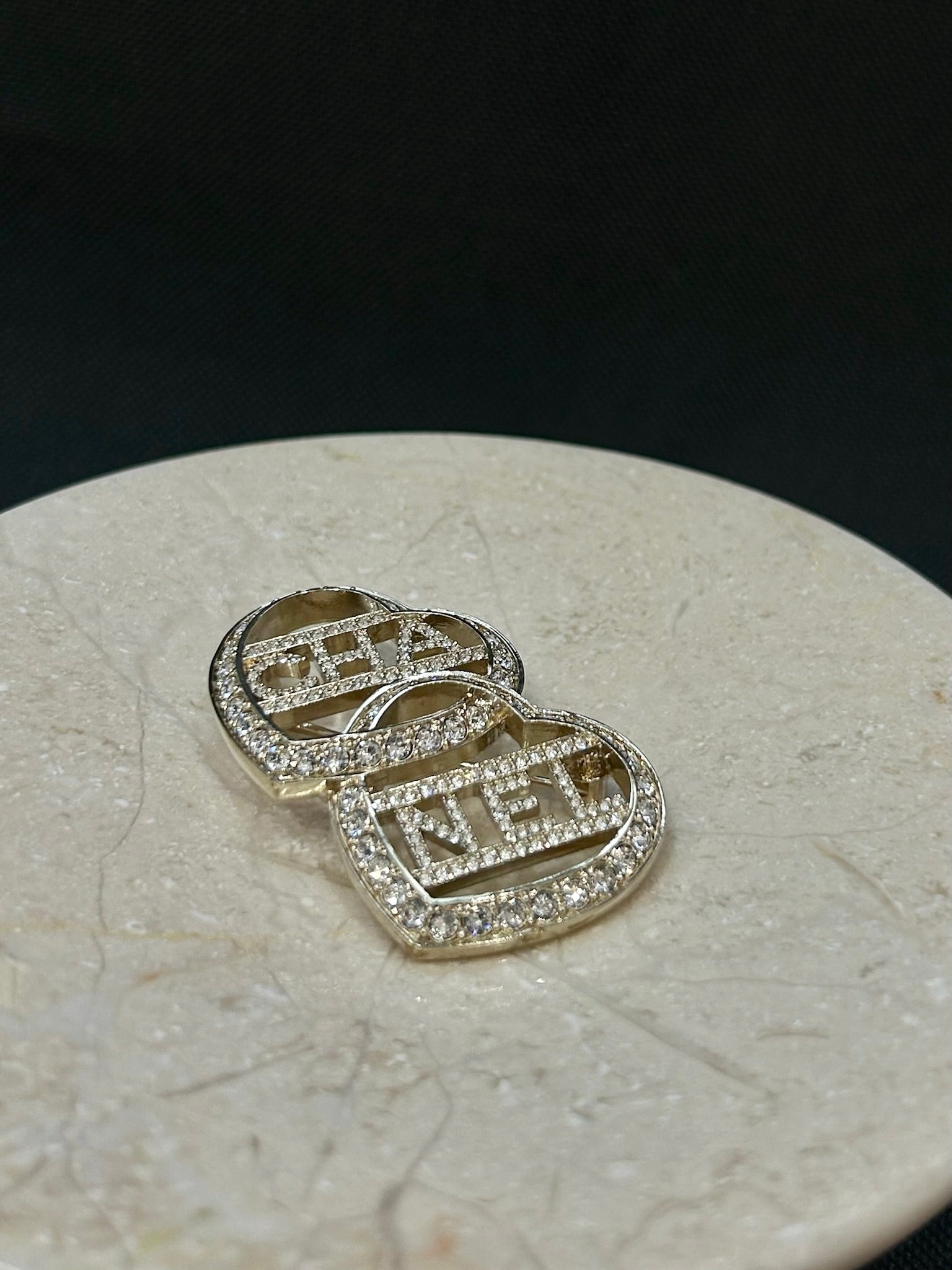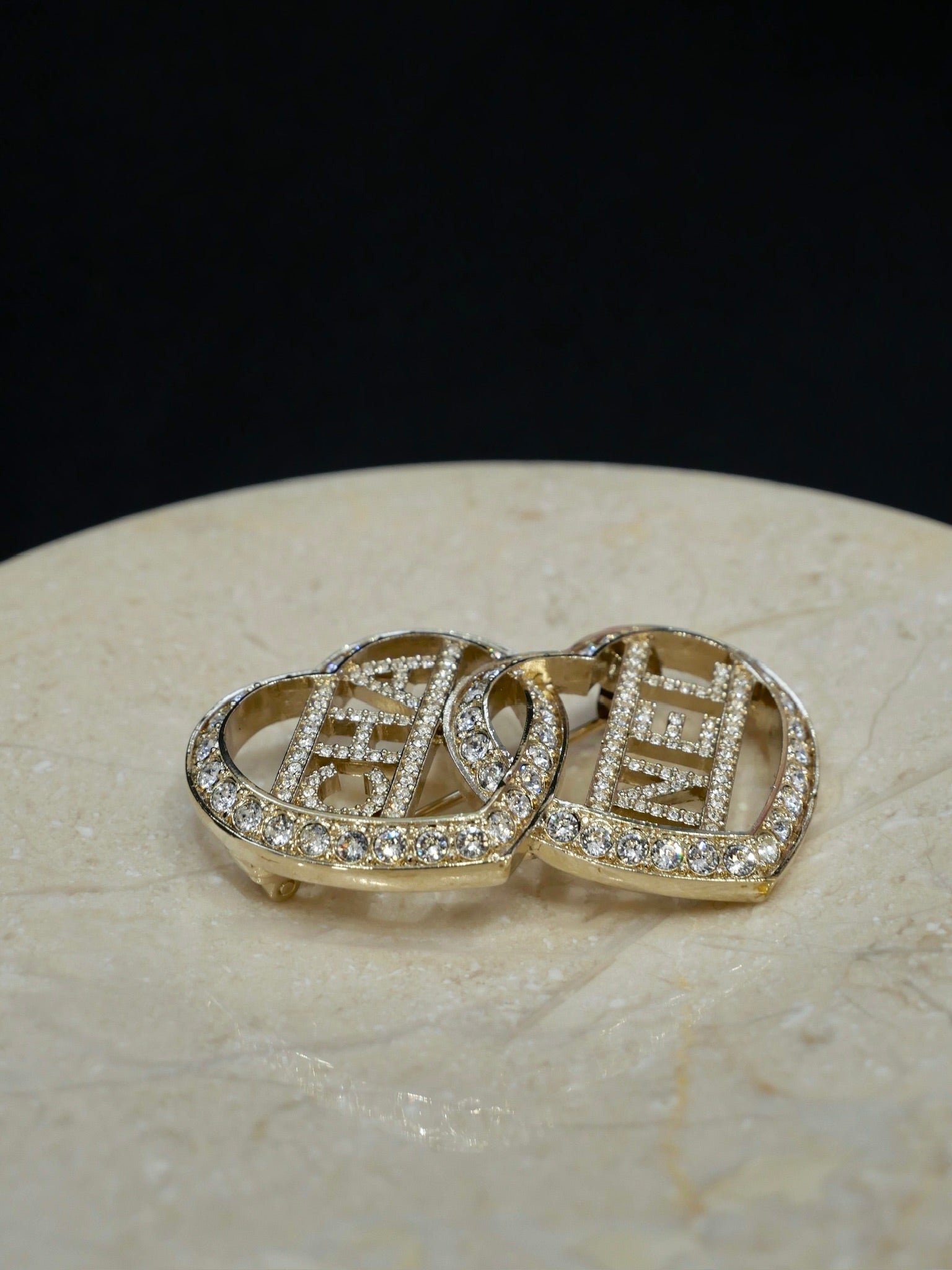 This Chanel 2023 brooch features a romantic double heart design adorned with shimmering crystals and subtle CC detailing. The intertwined hearts create a playful yet elegant statement, blending modern charm with Chanel’s signature sophistication—perfect for styling on blazers, knits, or bags.