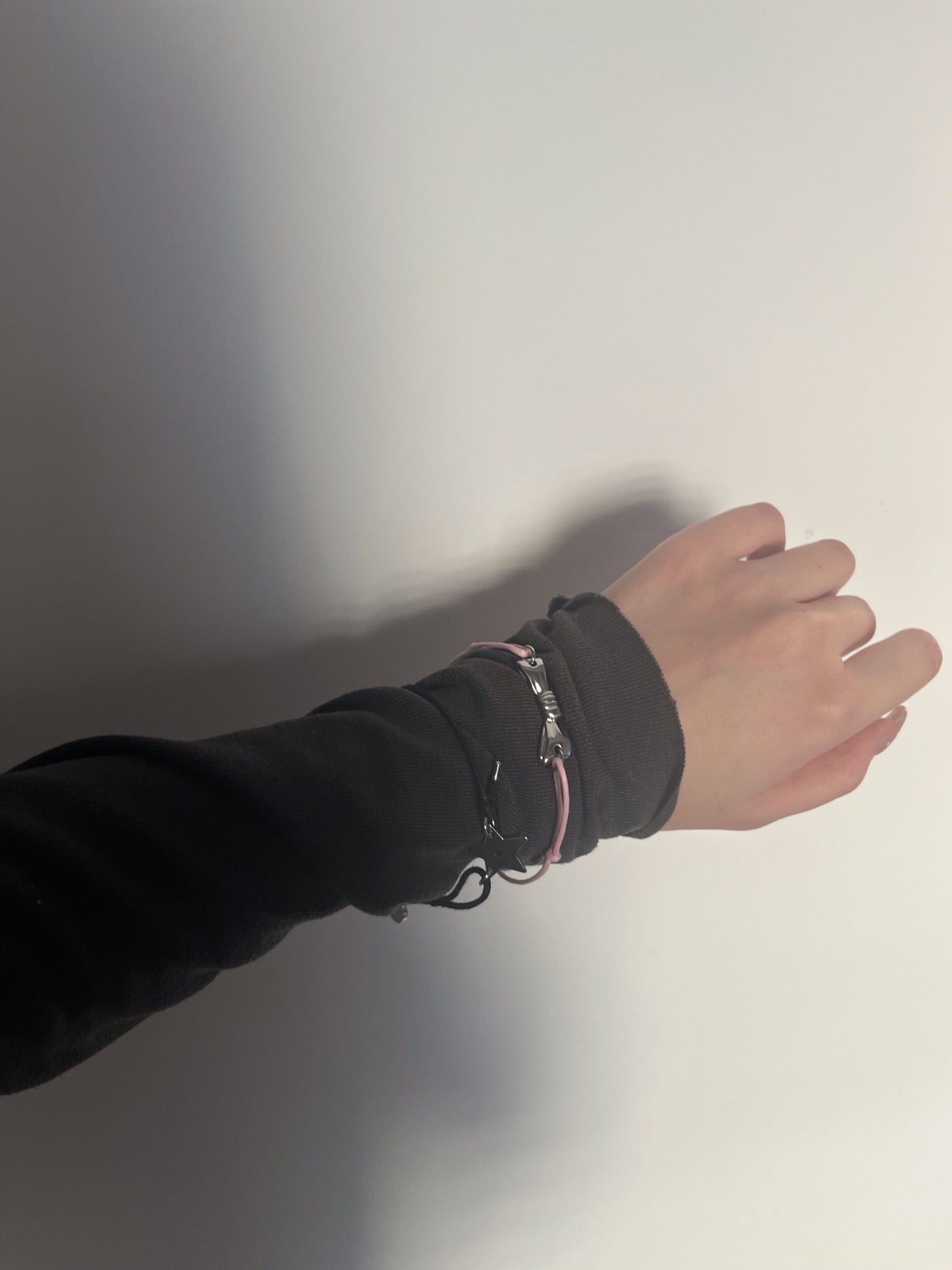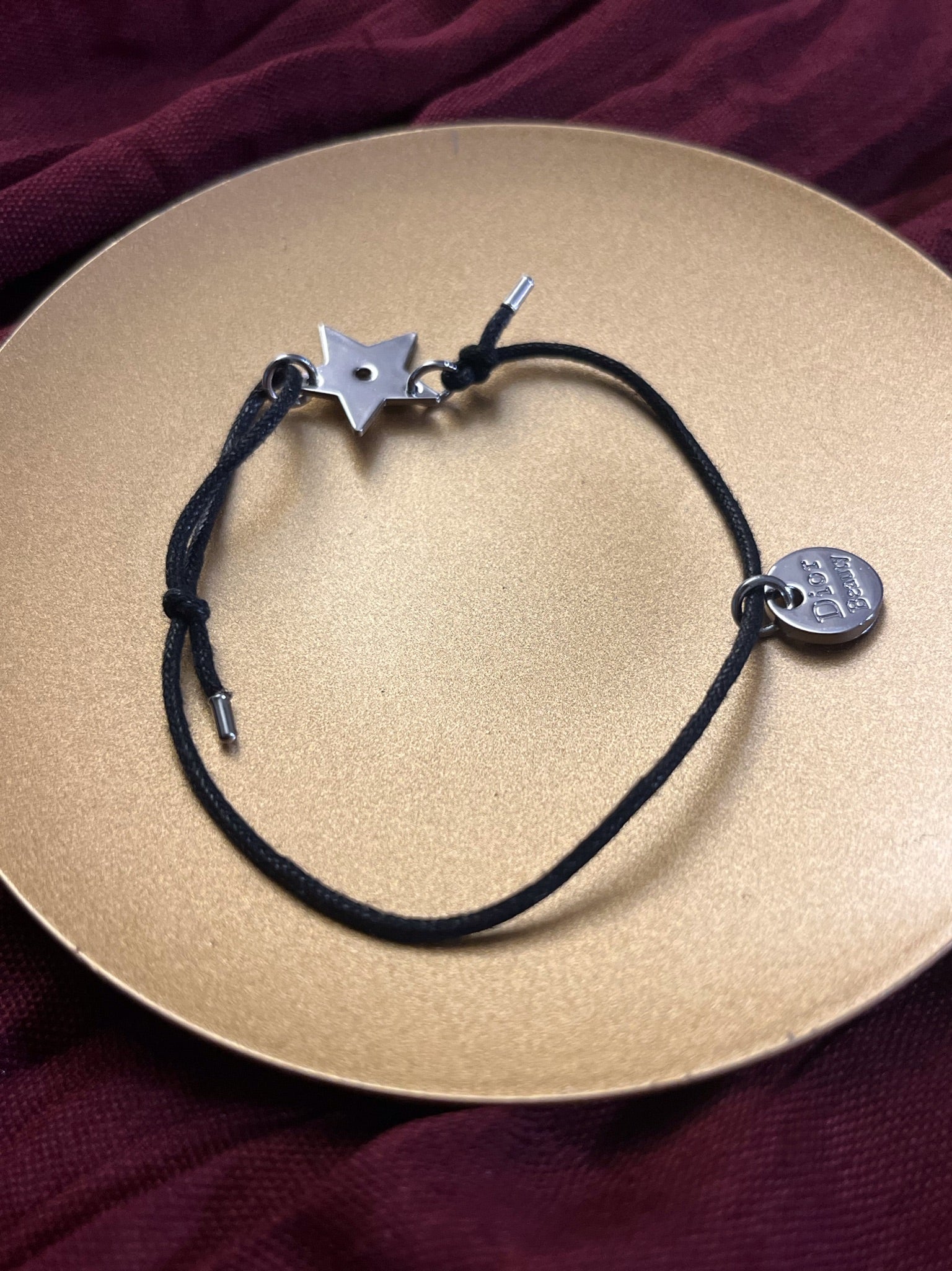 A charming Dior bracelet duo featuring two adjustable cord designs in contrasting colors. One bracelet comes in classic black with a minimalist silver-tone star charm, while the other features a soft pink cord adorned with a sculptural hand motif. Playful yet refined, this black-and-pink combination creates a subtle statement — perfect for stacking, mixing, or sharing.