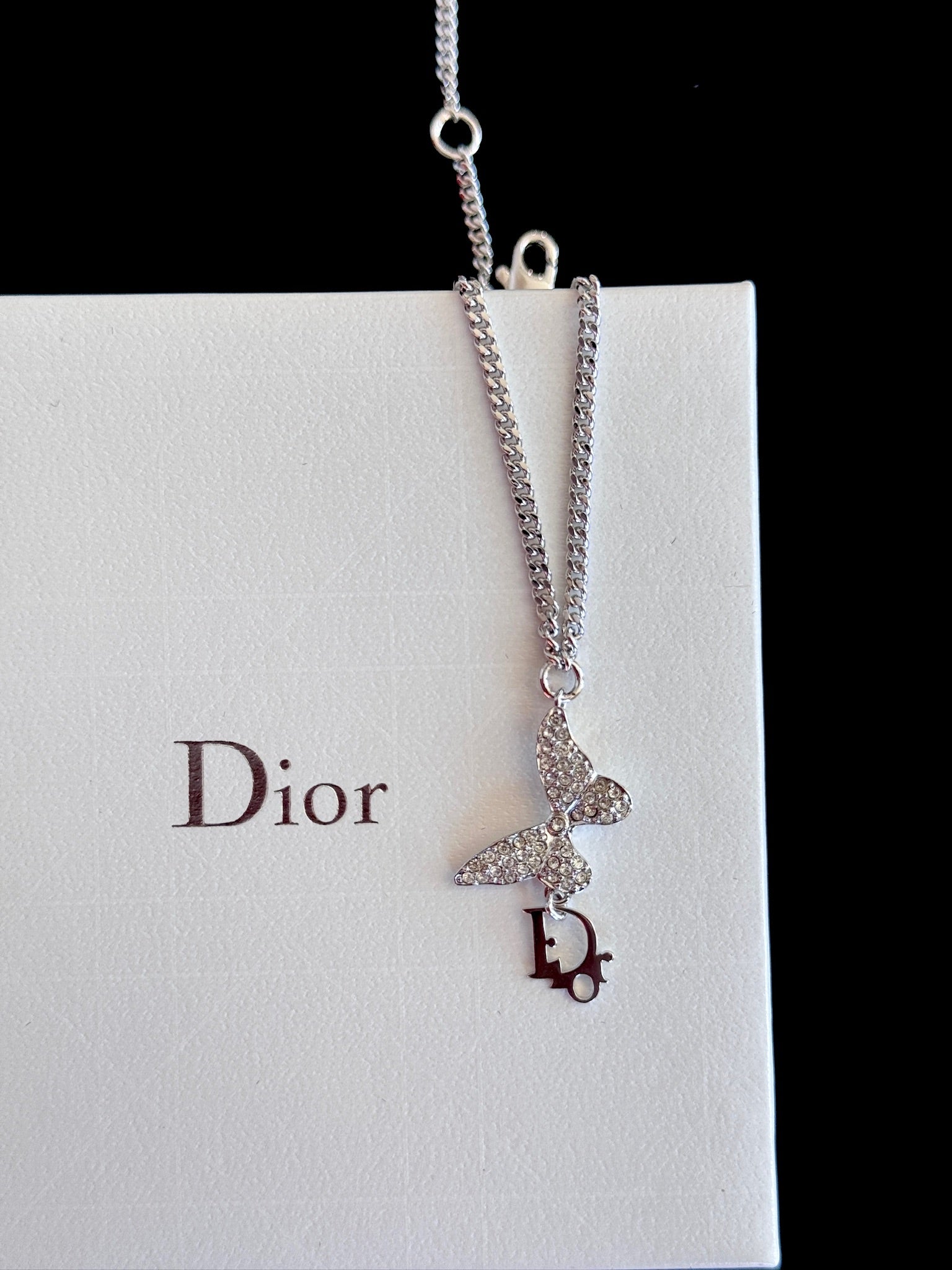 - Materials: Silver-tone metal, crystal-paved butterfly charm, Dior “D” logo charm