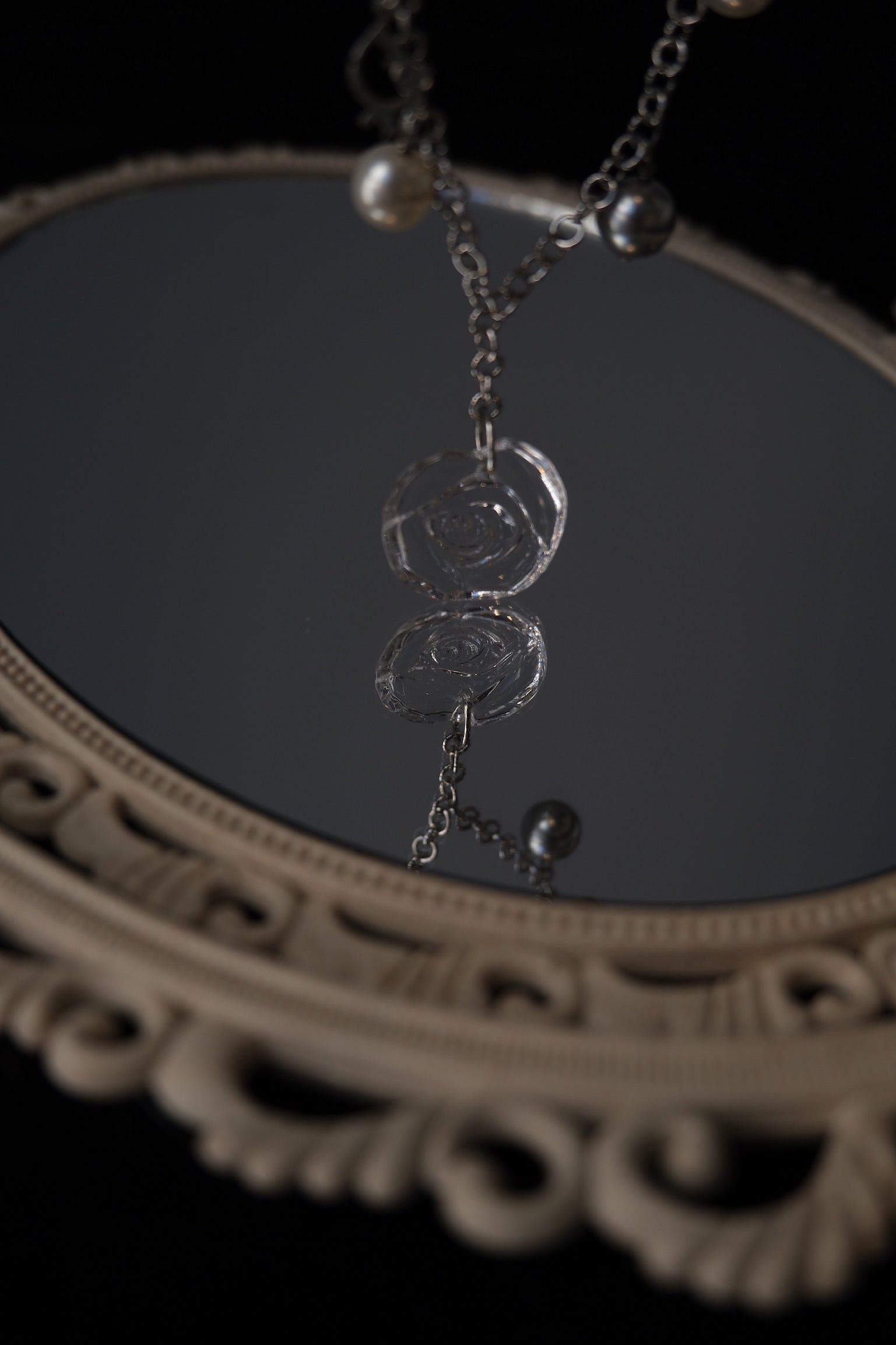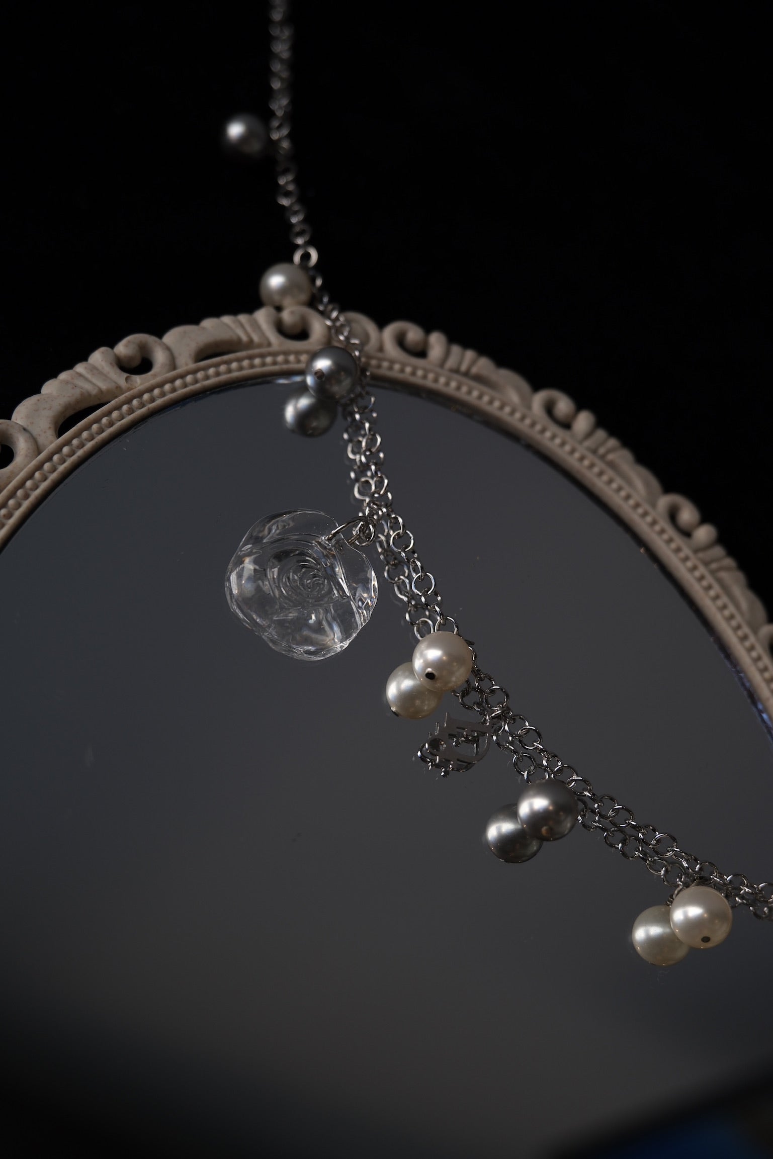 A rare Dior vintage necklace featuring a sculpted glass rose pendant and lustrous grey and ivory faux pearls. The layered silver-tone chain adds modern sophistication to its romantic charm — a perfect fusion of elegance and artistry.