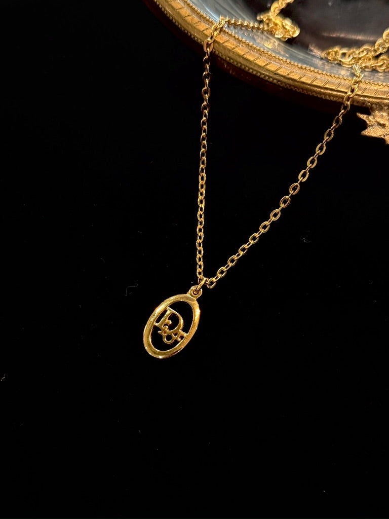 This timeless Dior vintage necklace showcases an elegant gold-tone oval pendant with the iconic “CD” logo at its center. Understated yet instantly recognizable, it’s a refined accent for both everyday and formal looks.
