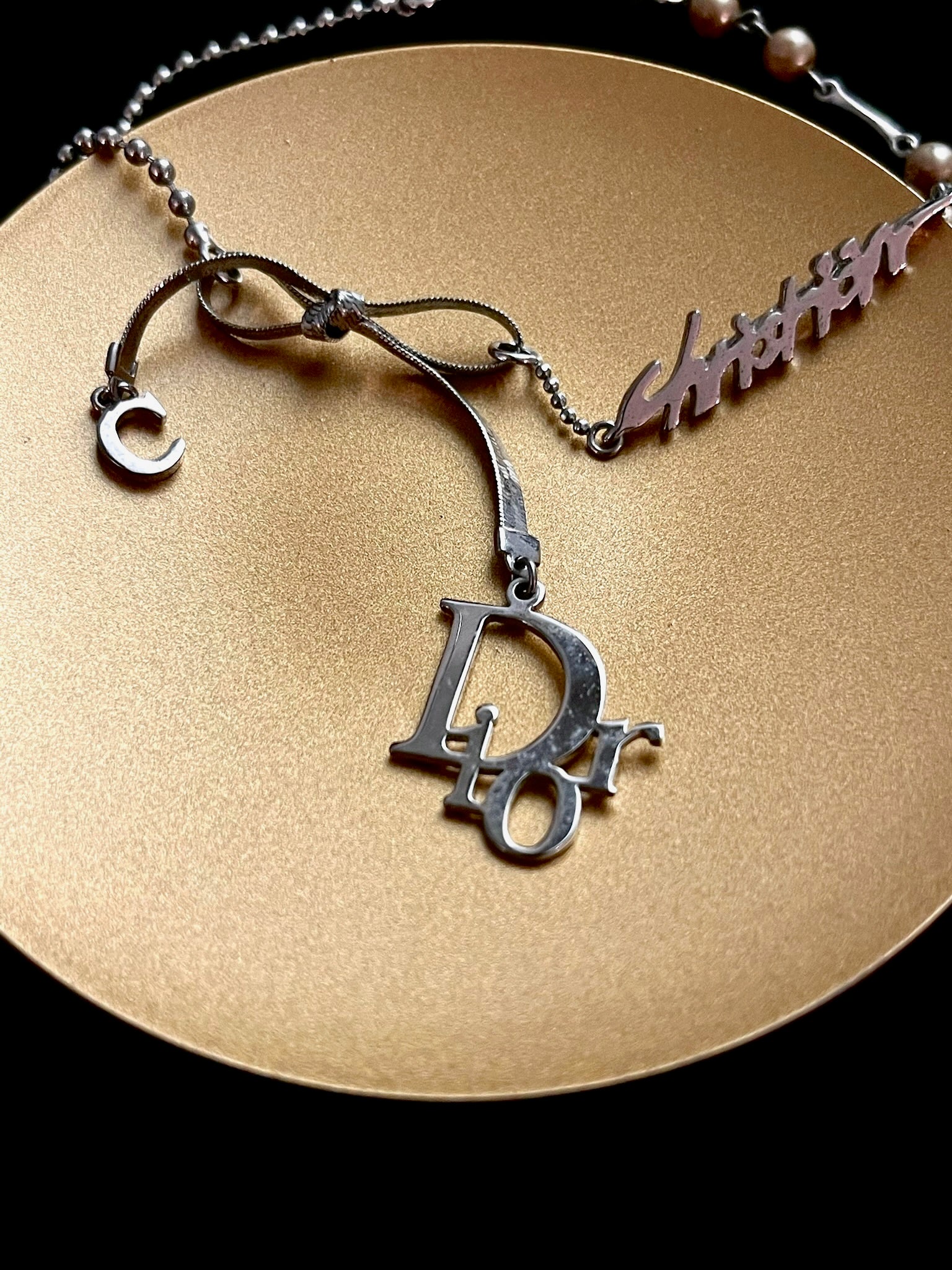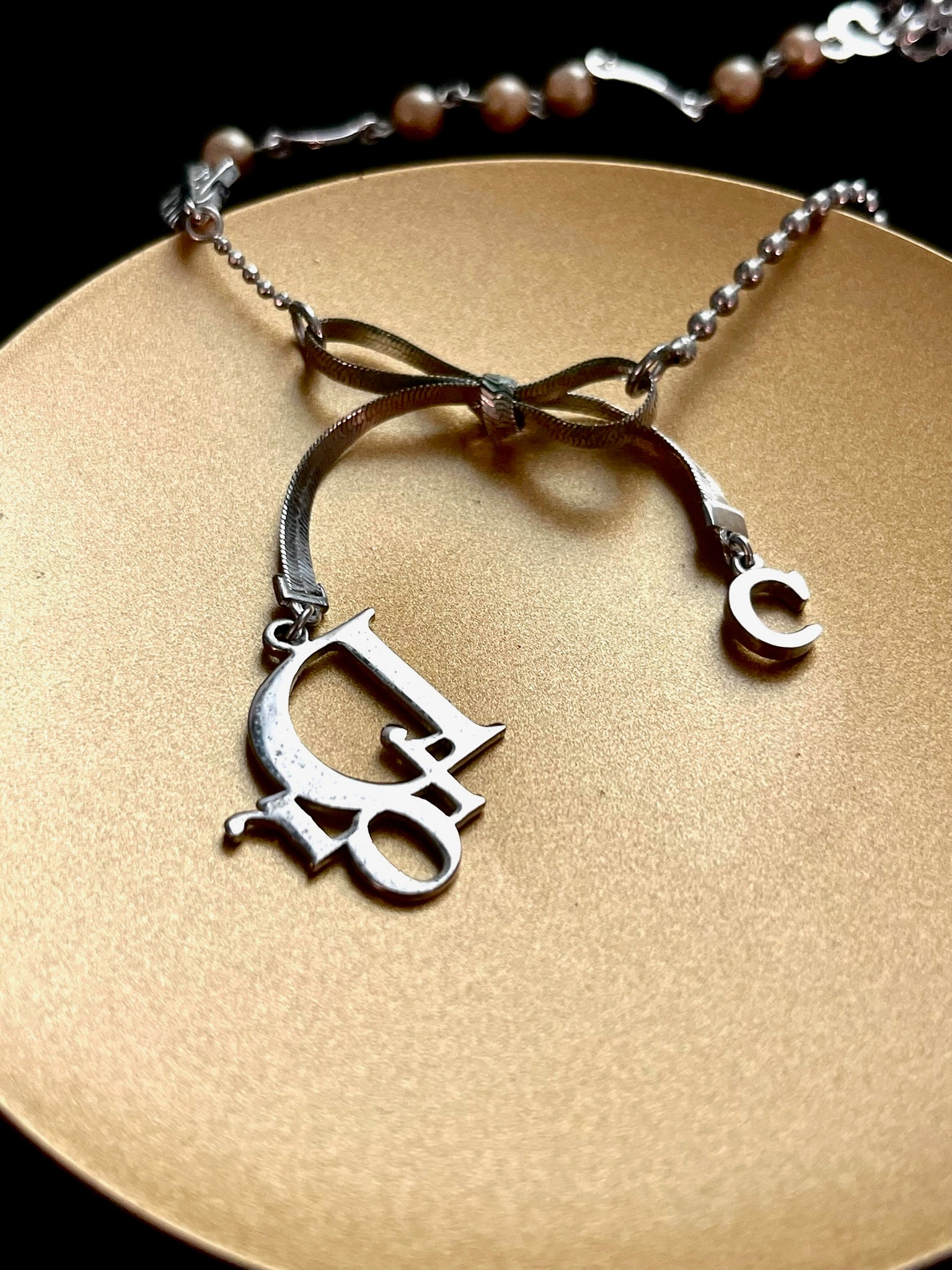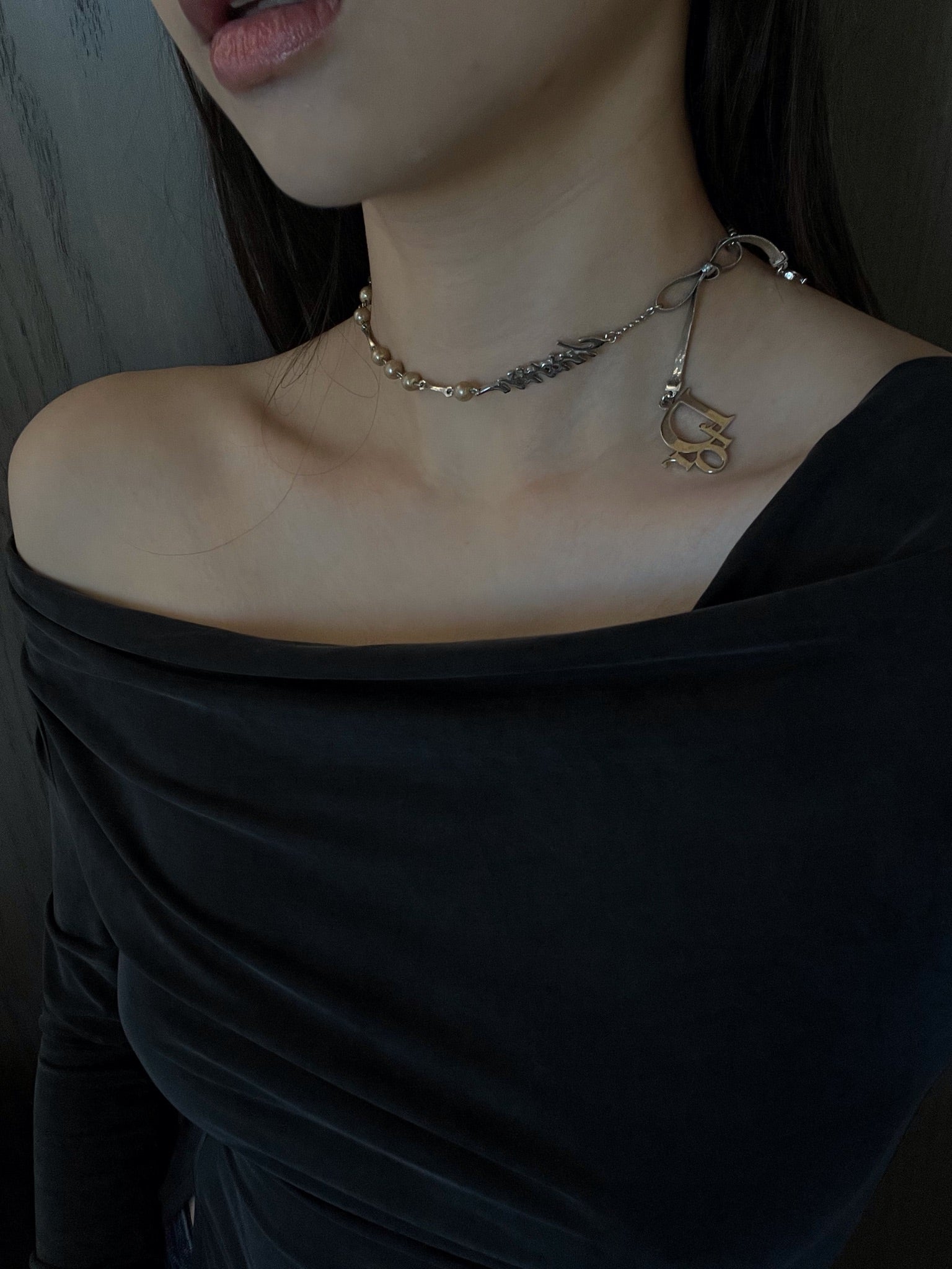 A rare vintage Dior choker that perfectly combines the house’s iconic elements — shimmering pearls and a delicate silver bow centerpiece. Sweet yet edgy, this versatile piece balances elegance and attitude for the ultimate balletcore-meets-agent aesthetic.