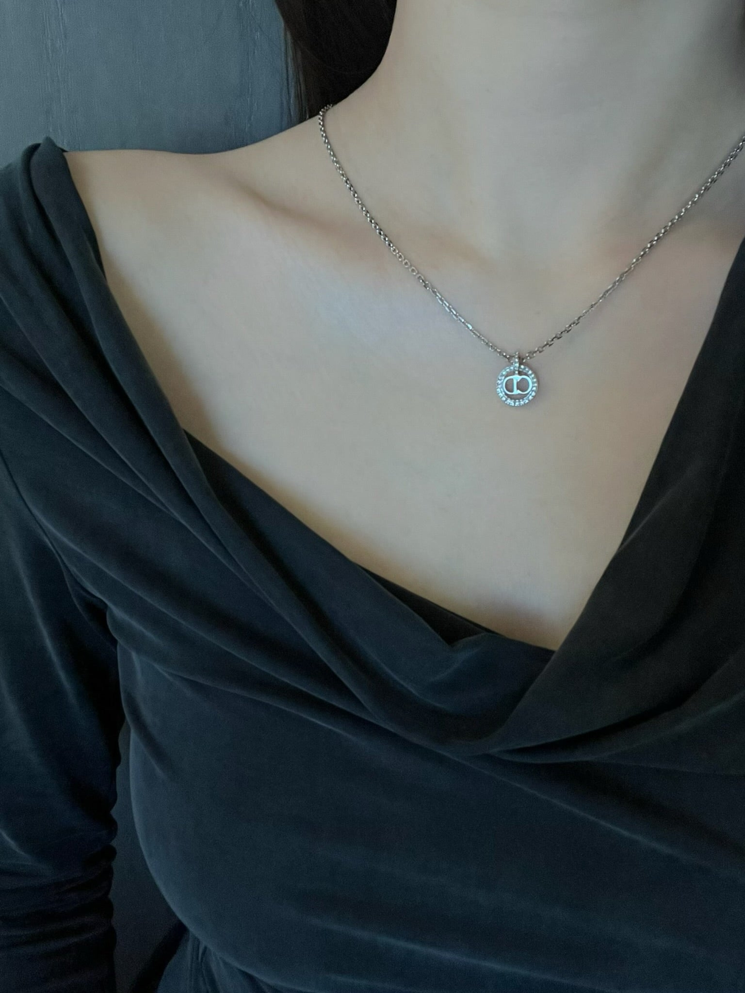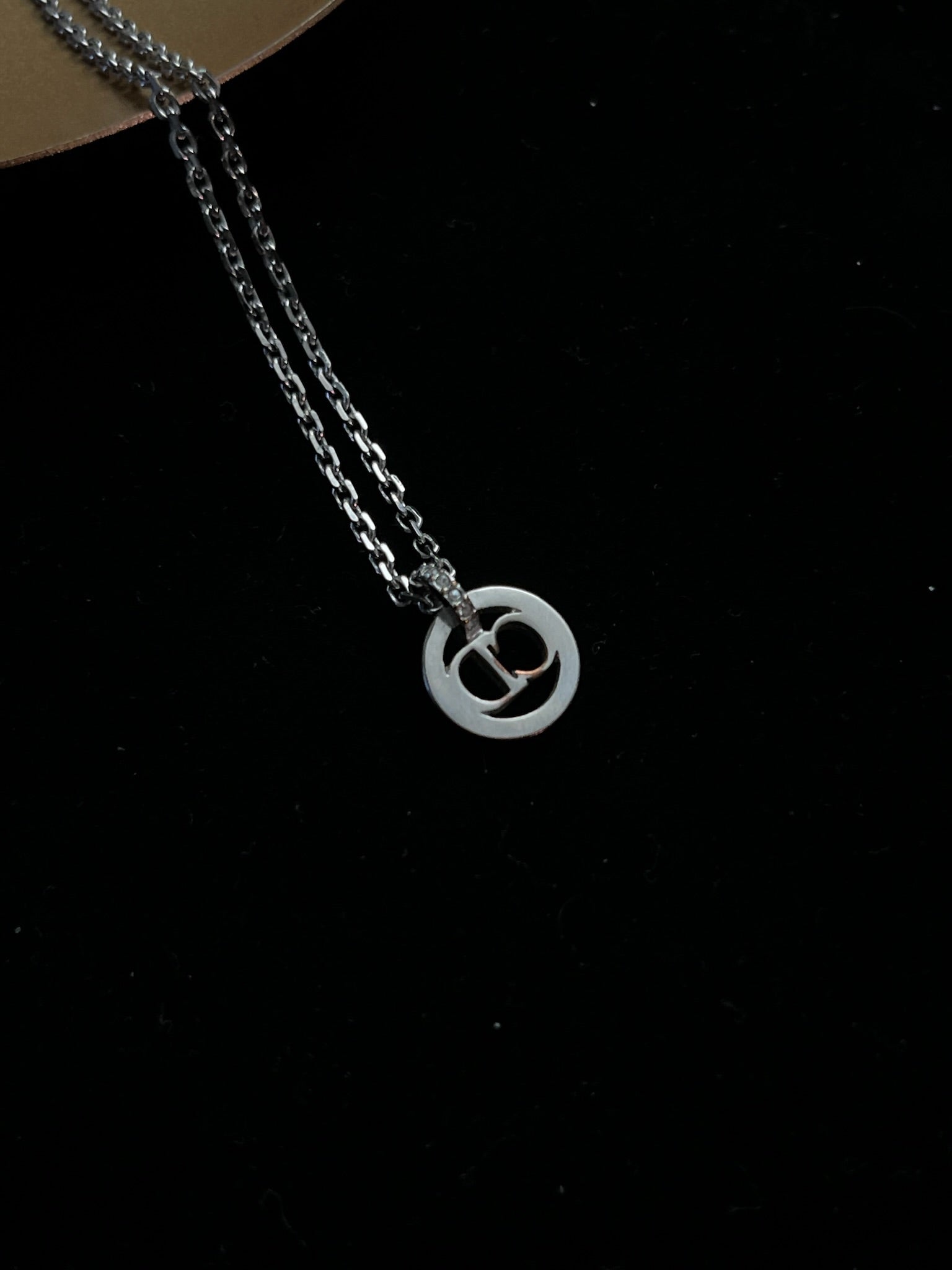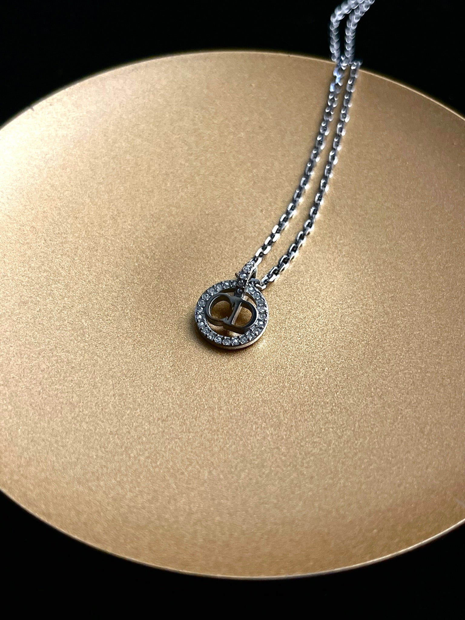 A stunning vintage Dior necklace featuring a silver-tone circular pendant adorned with sparkling crystals and the iconic CD logo. Effortlessly chic and versatile — perfect for everyday wear or adding a touch of elegance to any look.