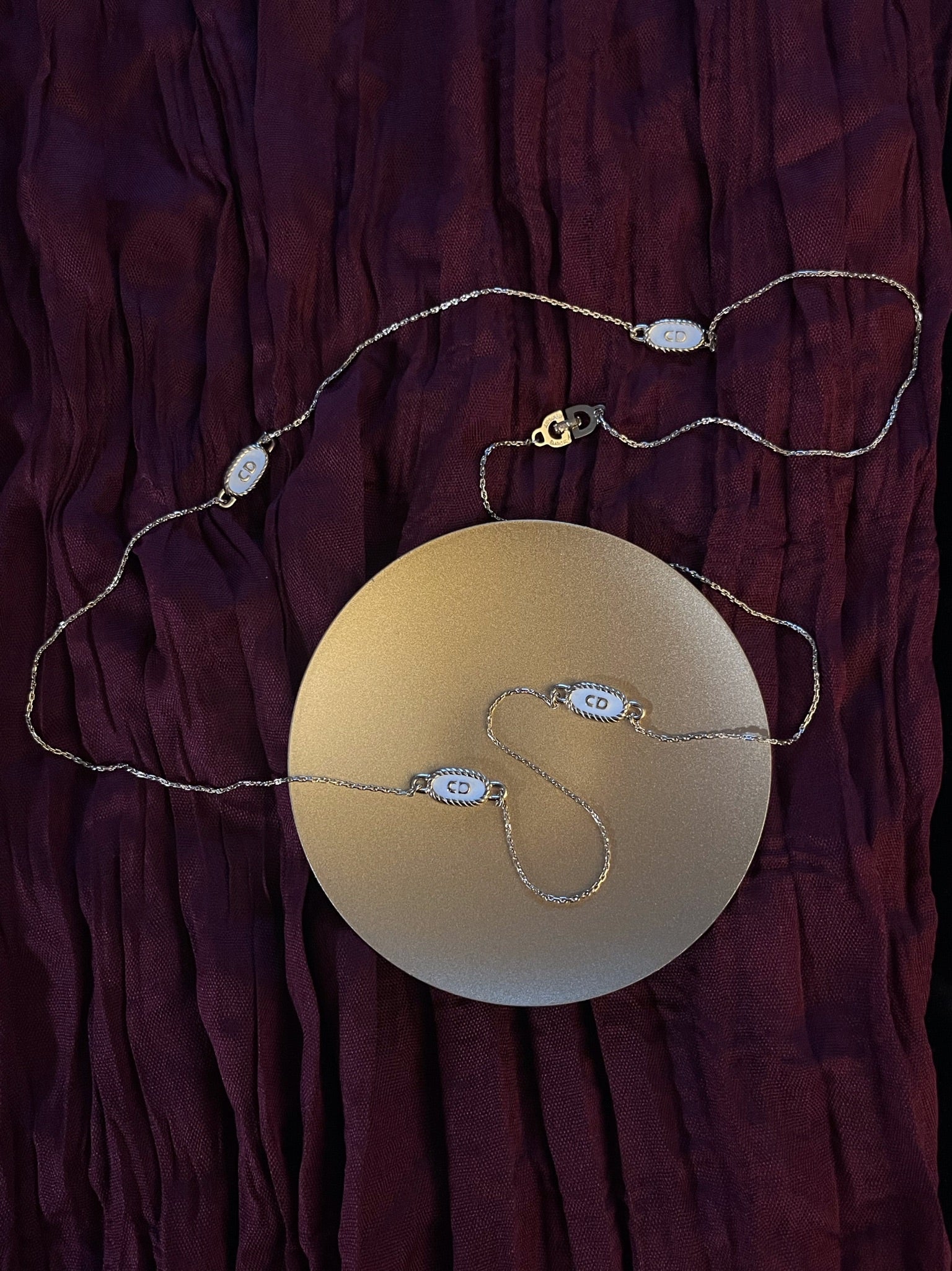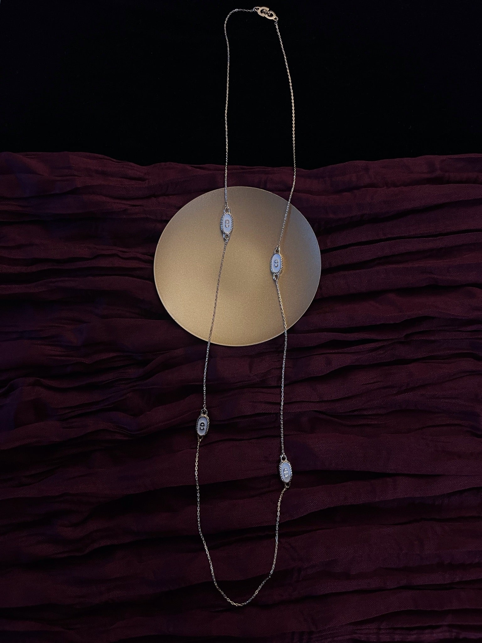 A rare Vintage Dior piece from the early 1990s, featuring a platinum-tone twisted rope chain and enamel CD detailing. With its adjustable length and flexible styling, this statement necklace effortlessly adapts from casual to elevated looks.