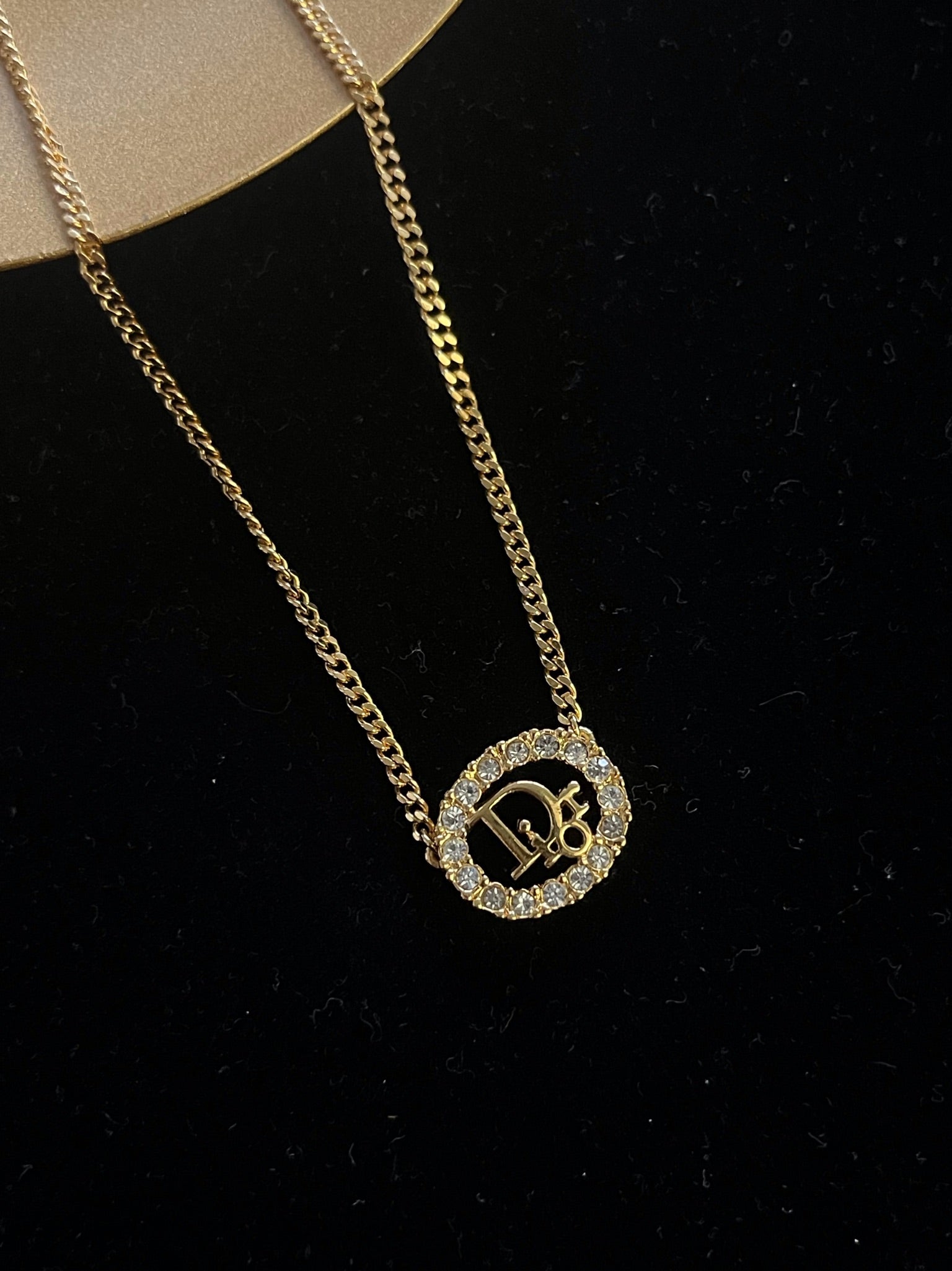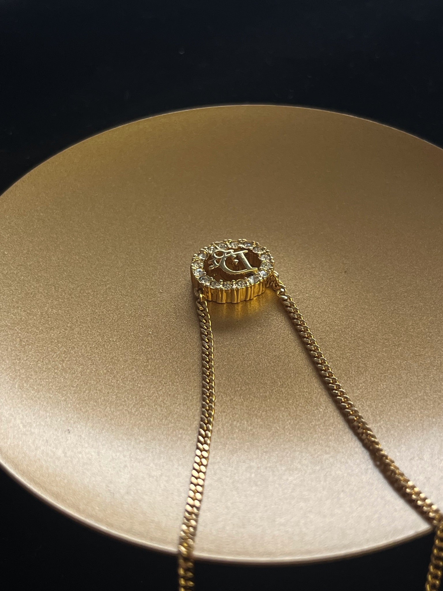 A timeless Dior necklace showcasing a classic oval pendant fully adorned with sparkling crystals. Elegant and feminine, this piece adds refined shine to both everyday looks and special occasions.