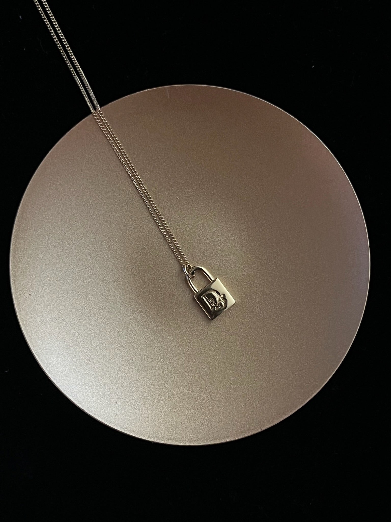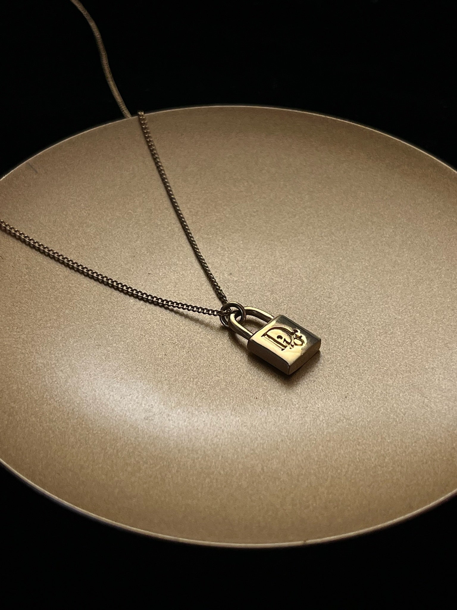 A chic and minimalist vintage Dior necklace featuring a gold-tone padlock pendant—stylish, timeless, and effortlessly elegant. Perfect for layering or wearing as a subtle statement piece.