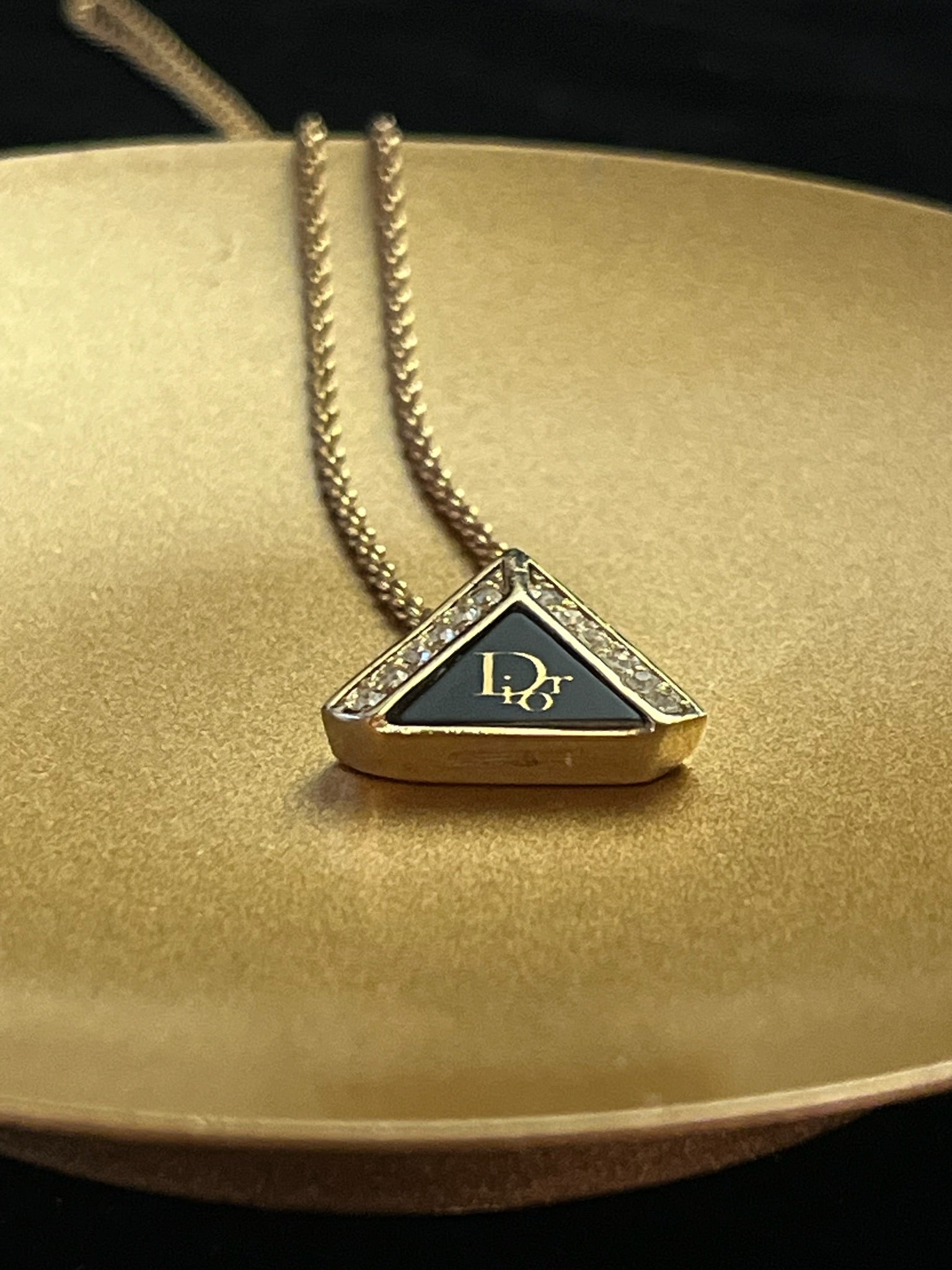 A striking Vintage Dior necklace featuring a geometric triangle pendant with a radiant, light-catching finish. Stylish, modern, and effortlessly versatile—perfect for adding a chic edge to both sweet and cool outfits.