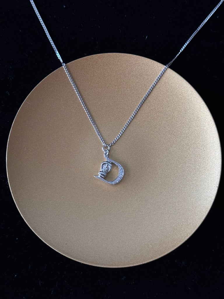 - Design: Silver-tone chain with crystal-studded "D" logo pendant