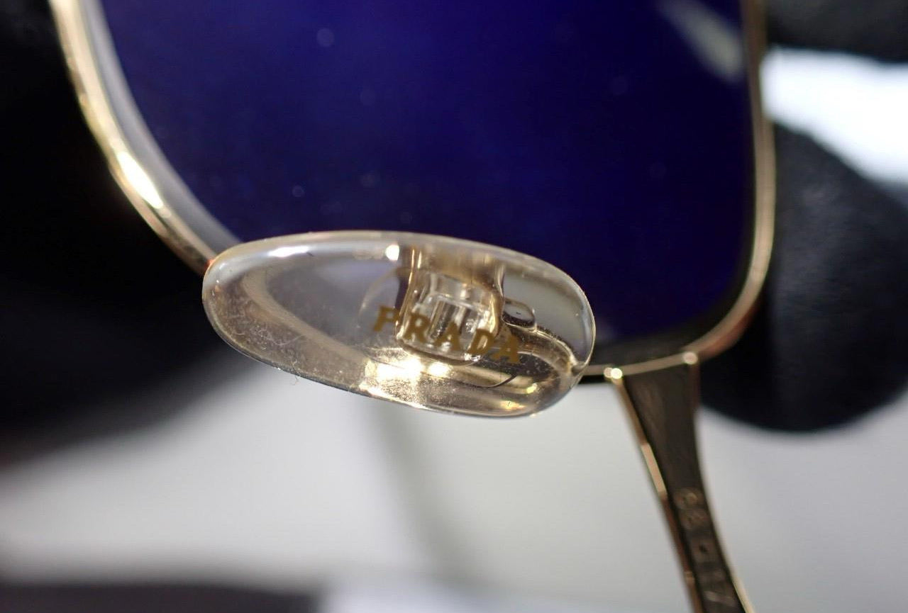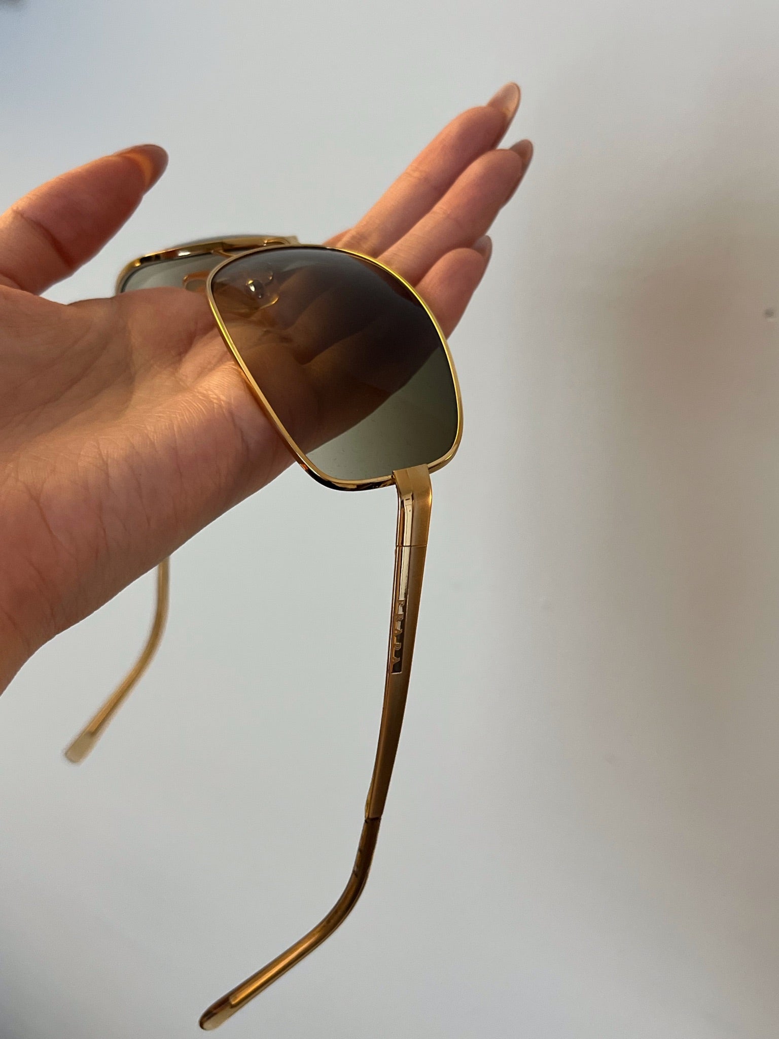 A sleek vintage Prada pair featuring a slim rectangular silhouette with softly tinted lenses and a polished gold-tone frame. The minimalist shape and refined metal construction create a look that feels both understated and effortlessly sophisticated. Timeless and easy to wear, these sunglasses add a chic designer finish to any outfit.