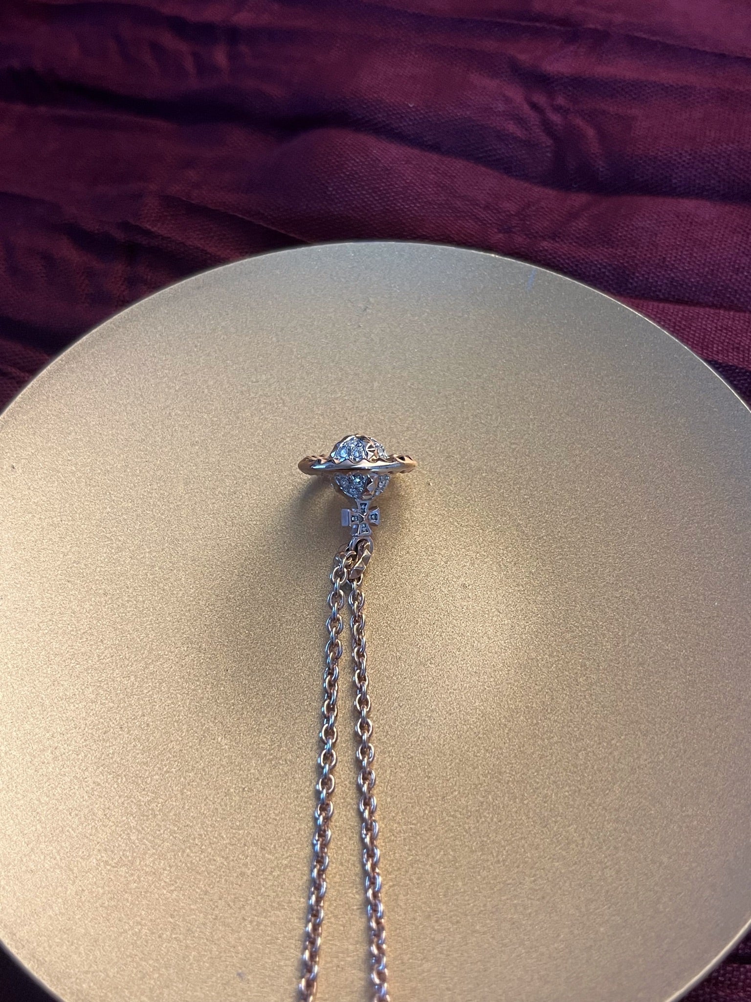 A delightful Vintage Vivienne Westwood necklace featuring a mini Orb motif fully adorned with sparkling crystals in a chic gold-and-silver two-tone finish. Cute yet iconic, this piece adds a playful sparkle to any look.